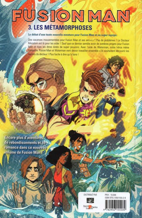 Des vacances mouvementées pour Fusion Man et ses ami.e.s ? Pas de problèmes ! Le Docteur Menstein est là pour les aider ! Sauf que ce dernier semble avoir de sombres projets pour Fusion Man et tous les êtres dotés de super pouvoirs. Avec l’aide de Waterman, notre héros mène l’enquête. Fusion Man et Waterman vont devoir travailler ensemble s’il souhaitent découvrir les secrets du docteur ! Plus facile à dire qu’à faire !