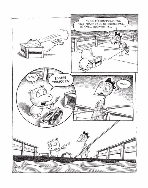 Jamais, depuis Quichotte et Panza, ou Laurel et Hardy, on ne vit un couple de héros aussi mal assorti. Fuzz est un nounours, battu et jeté à la poubelle par un sale gamin. Coq d'élevage, plumé et promis à l'abattage, Pluck est en cavale. L'un est aussi craintif et passif que l'autre est arrogant et agressif. Après avoir été vendus comme esclaves, après avoir subit la famine et frôlé la mort, après avoir combattu dans un arène d'animaux gladiateurs et fait sauter un pont, nos deux héros se retrouvent pour de nouvelles aventures toujours plus rocambolesques! Dans ce nouvel opus, Fuzz et Pluck découvre l'existence d'un arbre à pèze sur lequel pousse des billets de banque. Cette curieuse plante signifierait-elle la fin de la galère pour nos deux amis? L'ingéniosité stylistique dont fait preuve Ted Stearn, ne cesse de surprendre. Dans ce troisième tome, l'auteur multiplie les découpages audacieux, s'amuse avec le rythme de la narration et développe de nouveaux personnages complètement loufoques. L'ensemble est rehaussé par une qualité graphique indéniable et un humour à tout épreuve. La suite de Fuzz et Pluck promet de ravir ses nombreux fans et d'en conquérir de nouveaux.