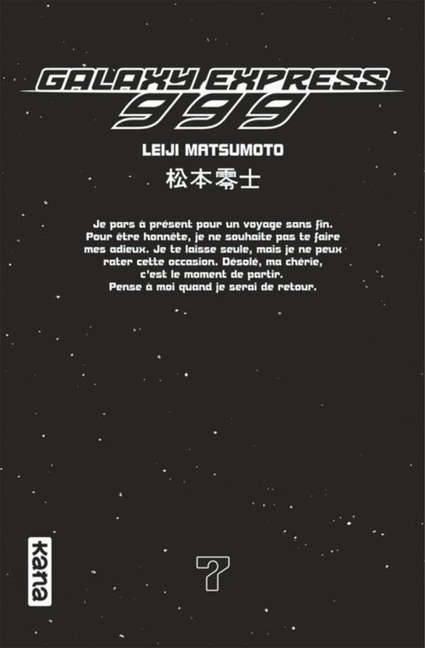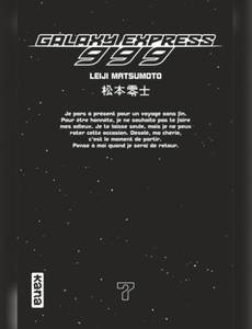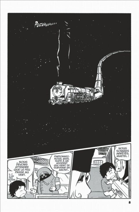 Une première dans l'histoire des voyages intergalactiques: la locomotive de tête du Galaxy Express 999 se détache et laisse nos deux voyageurs perdus dans l'espace. Tetsurô, livré à lui-même, voit le temps s'étirer en attendant les secours. Quel est le rôle de Maetel dans cette aventureoe Une étape de plus vers la destination finale de nos héros, la planète des corps robotisés.