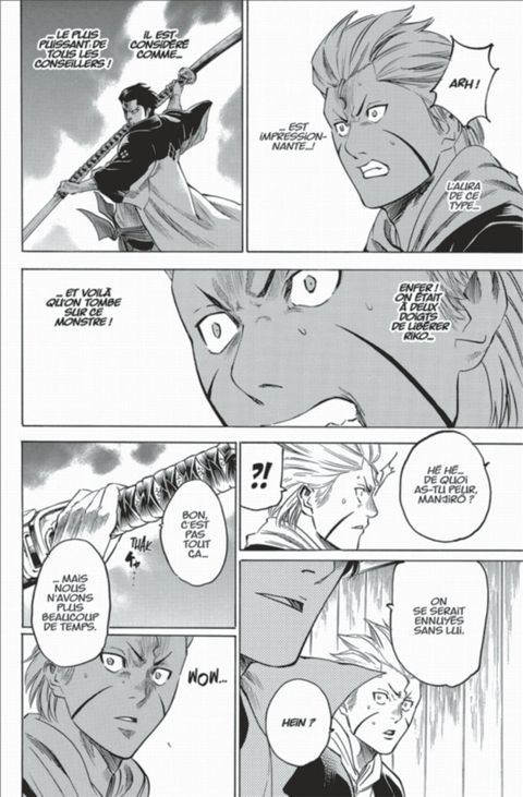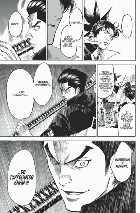 Le combat entre Iori et Ango Kury commence dans les geôles souterraines du Honmaru ! Iori doit essuyer les redoutables assauts au nagamaki. Quelle stratégie Iori va-t-il adopter face à ces attaques impossibles à esquiver et à parer ?! De son côté, Gama rejoint enfin Naoyoshi et engage le combat contre Ranmaru !