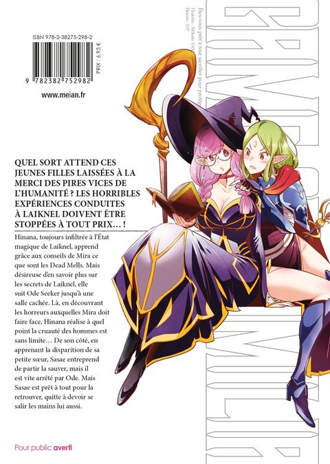 Quel sort attend ces jeunes filles laissées à la merci des pires vices de l'humanité ? Les horribles expériences conduites à Laiknel doivent être stoppées à tout prix... !Hinana, toujours infiltrée à l'État magique de Laiknel, apprend grâce aux conseils de Mira ce que sont les Dead Mells. Mais désireuse d'en savoir plus sur les secrets de Laiknel, elle suit Ode Seeker jusqu'à une salle cachée. Là, en découvrant les horreurs auxquelles Mira doit faire face, Hinana réalise à quel point la cruauté des hommes est sans limite... De son côté, en apprenant la disparition de sa petite soeur, Sasae entreprend de partir la sauver, mais il est vite arrêté par Ode. Mais Sasae est prêt à tout pour la retrouver, quitte à devoir se salir les mains lui aussi.Pour sauver sa soeur, il va devoir vaincre la combattante la plus forte de cette nation magique...Et en corrompre l'élite !!