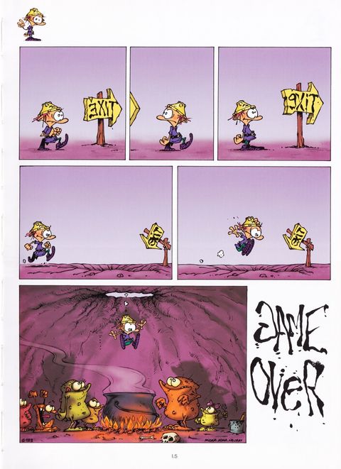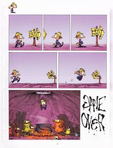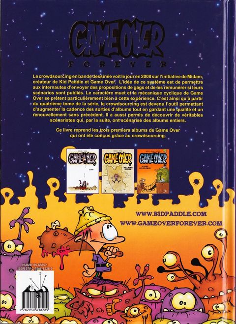 Intégrale en tirage unique des tomes 4 à 6 de Game Over édités par Mad Fabrik : On fait difficilement plus simple comme jeu vidéo : un petit héros particulièrement maladroit, une princesse stupide, hystérique et presque aussi gaffeuse que son sauveur, et puis des tas de Blorks, plus laids, cruels et vicieux les uns que les autres, et qui n'ont qu'un but dans leur vie virtuelle : empêcher le premier de délivrer la seconde. Et si, au passage, ils peuvent les massacrer joyeusement, ils ne vont pas se gêner, entraînant ainsi l'inéluctable "Game over" qui rythme chaque fin de page de la série. C'est sur ce canevas simple que Midam nous régale de gags muets et gore d'une efficacité redoutable.