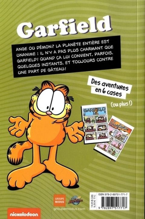 Ange ou démon ? La planète entière est unanime : il n'y a pas plus charmant que Garfield ! Quand ça lui convient. Parfois. Quelques instants. et toujours contre une part de gâteau ! Des aventures en 6 cases ! Parfait pour les plus jeunes qui découvrent le plaisir de la BD et les plus grands qui veulent retrouver le plaisir de Garfield en 6 cases, ou presque.