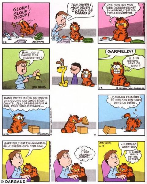 Garfield est beau ! Ca, c'est nouveau. En tout cas, il sort gagnant d'un concours de matous. Ca ne l'étonne d'ailleurs pas du tout et ça ne lui change pas le caractère : victime de fréquentes "crises de roupillons", il ne songe à maigrir que lorsqu'il ne voit plus ses pieds. En clair, comme toujours, il dort et il s'empiffre. Il a aussi des coups de coeur : il rend la liberté à une souris parce qu'il pense que peut-être elle est "mère de famille ou institutrice ou je ne sais quoi d'utile dans sa communauté". En fait, s'il respecte les souris, c'est parce qu'elles sont plus fatigantes à chasser que les lasagnes. Il nous présente des nouveaux personnages, aussi, comme cette merveilleuse tante Gertrude - elle ne peut pas l'encadrer - qui donne des cours de rap à la maison de correction.