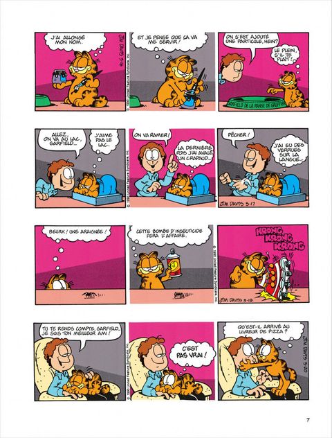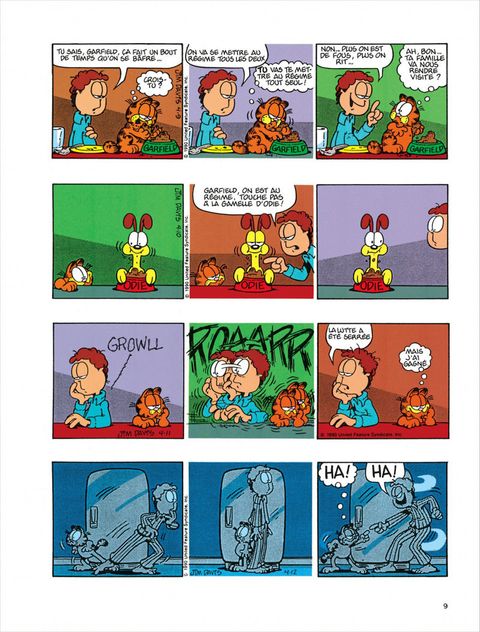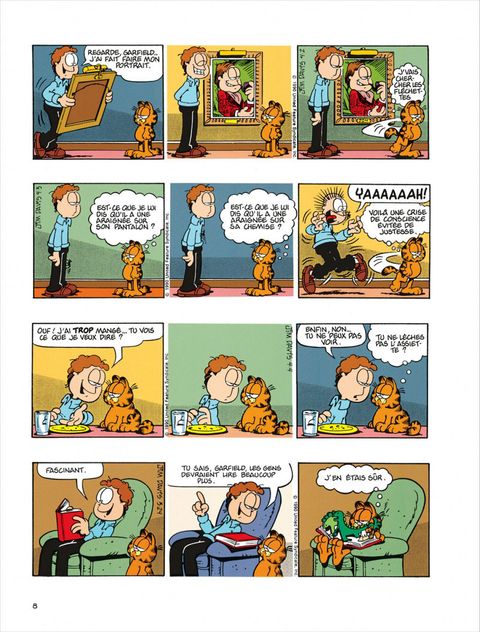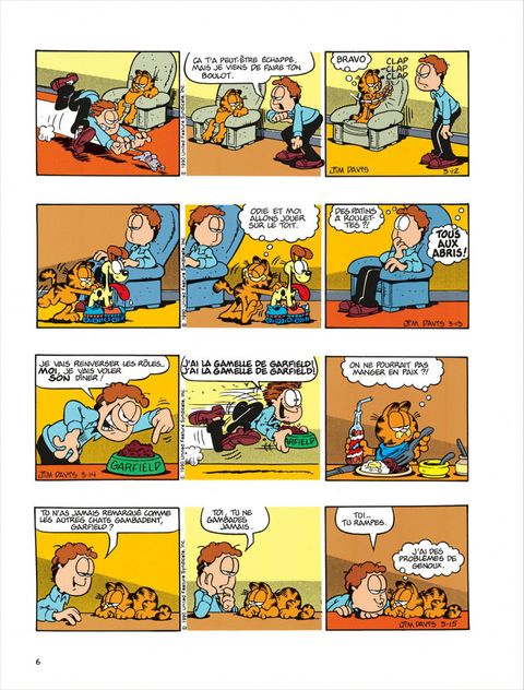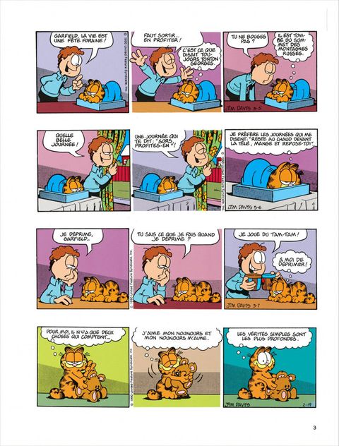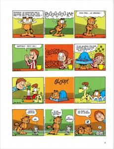 Garfield se découvre une âme ludique : il glisse sur des peaux de banane pour se faire rire et nous gratifie d'une série d'imitations très réussies : Mona Lisa, un papillon sur un pare-brise, un bouchon de Rolls. Mais en général, il ne sort de sa léthargie que pour se montrer désagréable. Par exemple, Jon ayant acheté des rideaux pré-lacérés (style grunge), il se donne du mal de chien à les recoudre. Le reste du temps, il met toute son intelligence au service de ses deux obsessions majeures : bouffer et dormir. Il déploie une patience énorme pour attraper les oiseaux : à plat ventre devant une boîte d'oeufs, il attend. En vrai professionnel, il est capable de reconnaître une blanquette trop salée en suçant une tache sur la cravate de Jon. Dans le domaine du sommeil aussi, il est le plus fort, il fait des ZZZ beaucoup plus ouvragés que ceux de Jon et Odie. L'idéal, c'est quand il arrive à faire cohabiter sa flemme et sa goinfrerie. Par exemple en écoutant une histoire que lui lit Jon pour l'endormir : "Emincer un petit oignon, faire fondre dans du beurre, etc." Là, pour peu qu'il ait englouti avant une tonne de lasagnes, Garfield nage en plein nirvana.
