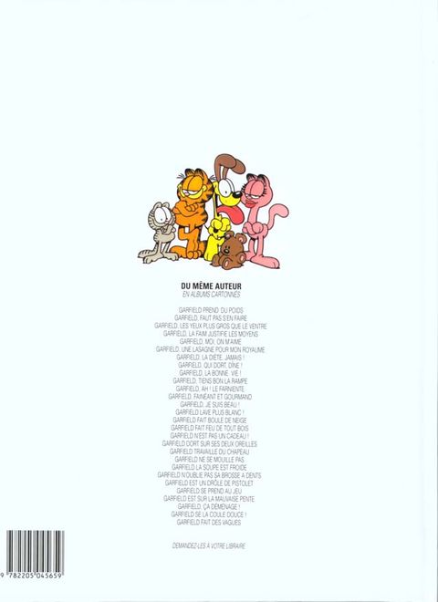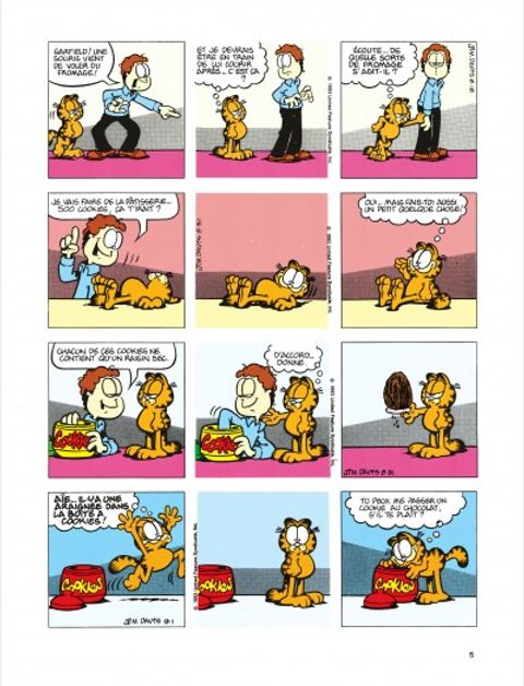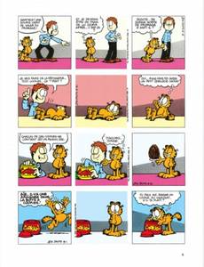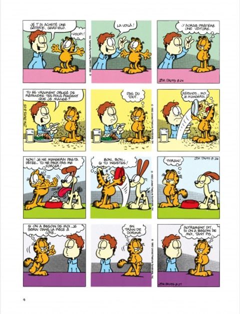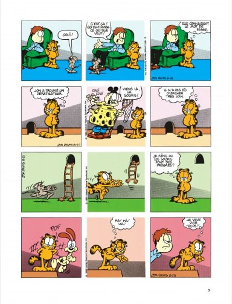 Bouffe Garfield vient de faire un régime de 15 jours. Résultat : il a perdu deux semaines. Même sa balance parlante en a marre : "Tire-toi de là, j'en peux plus." Communication homme-chat Quand Garfield a l'air heureux, ça rend Jon soupçonneux. Et voir Jon soupçonneux rend Garfield heureux. C'est une sorte d'équilibre. Drague Jon a tout compris : il faut se valoriser en mettant l'accent sur ce qu'on a de bien. Comme il a des gencives en bonne santé, il les montre. Ça ne marche pas fort. Tact Comment dire "gentiment" à Jon qu'il a mauvaise haleine ? En lui offrant un cachou taille XXL. Activité Garfield a bougé une fois, en 1992. Sinon, il mime avec beaucoup de talent le chat vautré et, les jours de grande forme, le dindon qui patine dans la semoule. Communication chat-chien Garfield avait organisé une course "vers" le mur, Odie s'est planté "dans" le mur. Il a gagné. Noël Cette année, ils passent tous Noël à la ferme, chez les parents de Jon. C'est sympa. Ils mangent des petits gâteaux en forme de machines agricoles et boivent du grog à l'ail. Mais Jon et son frère sont en désaccord sur un point crucial : la supériorité des pyjamas à lapins sur les pyjamas à nounours. C'est ça, la famille. Pistolet D'après Larousse, un drôle de pistolet est un type un peu bizarre. C'est de la diffamation : Garfield est normal, pour un chat.