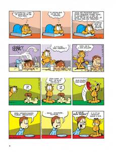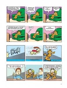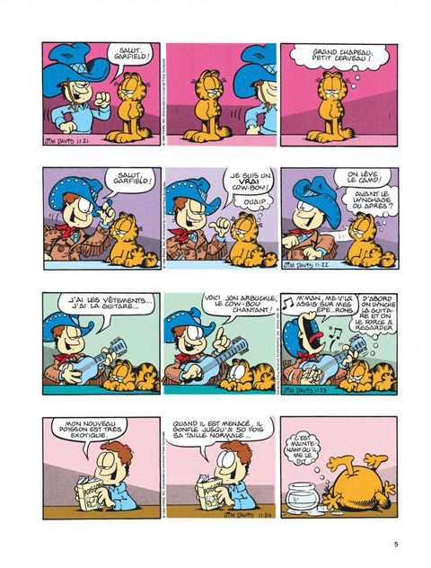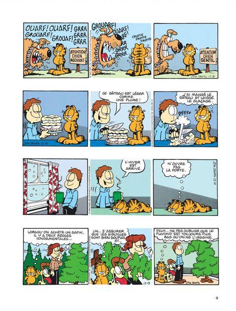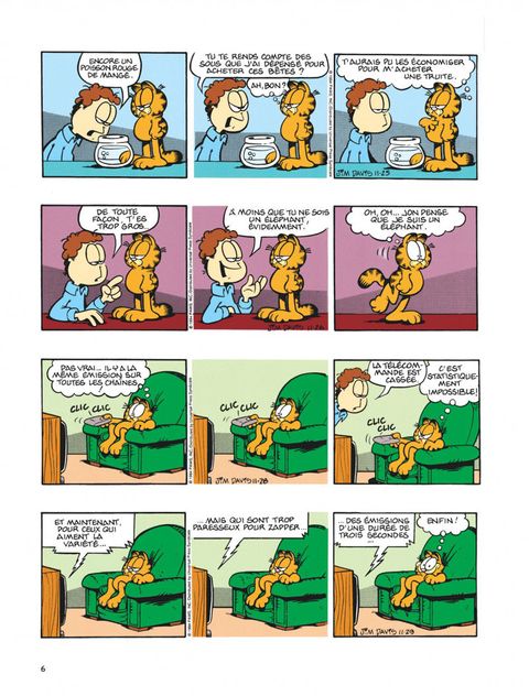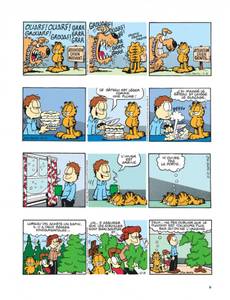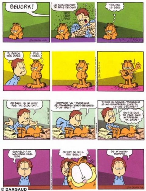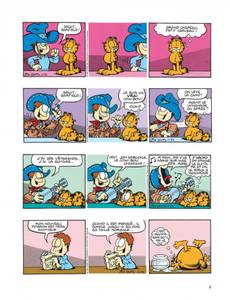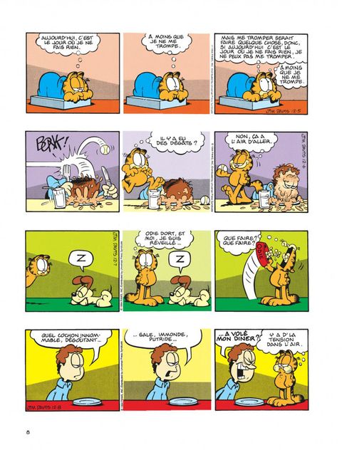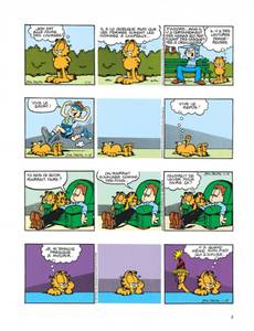 Le grand-père de Garfield, Otto le fou, était un pionnier. Il a fait parcourir des milliers de kilomètres à sa famille, à travers des contrées hostiles, en répétant : "J'entends un ouvre-boîte." Et si Garfield n'a rien du pionnier, il continue d'entendre les ouvre-boîtes. Avec lui, les souris n'on rien a craindre : il ne course que le gruyère. En revanche, écrabouiller les araignées demandant peu d'effort, il nous fait un génocide. Quant aux oiseaux, à la seule idée qu'ils sont en train de s'empiffrer de gros vers juteux, il les laisse où ils sont. Côté flemme, Garfield dort dix-huit heures et neuf minutes d'affilée. Ça, c'est sur le ventre. Il pense pouvoir faire mieux sur le dos. L'idée de s'amuser comme un fou lui plaît bien, comme ça, de loin. Mais pour s'amuser, il faut au moins se lever. Alors il préfère se barber. Côté coeur, les tentatives de Jon sont toujours aussi piteuses. Quand il annonce à une fille qu'elle a gagné une soirée avec lui, elle répond qu'elle aurait préféré un lave-vaisselle. Garfield, toujours de bon conseil, lui suggère de contre-attaquer avec un grille-pain. Lui, pour Noël, il a eu un pull 100% poil de vache avec pis incorporé. C'est très seyant, sur un vieux gros chat de dix-sept ans...