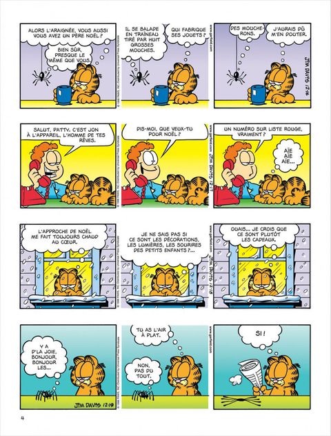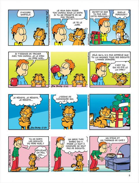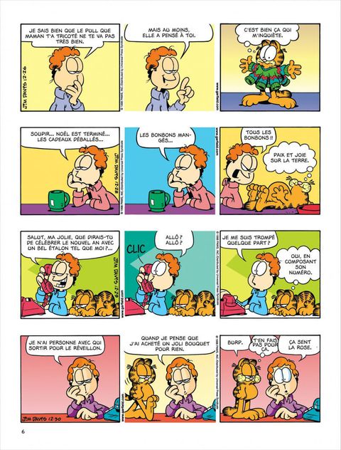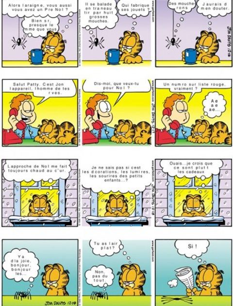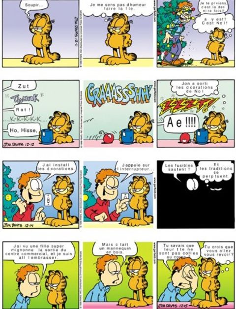 Malgré les apparences, Jon est un fantaisiste : il entend parfois une petite voix intérieure qui lui dit de faire un truc complètement fou. Mettre un kilt, par exemple. C'est sûrement pour ça que sa vie sentimentale est toujours aussi désertique. Pour Noël, sa copine veut un numéro sur liste rouge. On se demande ce qu'elle veut dire par là. Du coup, il appelle Hélène, qui ne souhaite pas sortir avec lui. Tant pis. Il ne veut pas de sa pitié. Sauf si elle insiste... Après, il appelle Monsieur Smith pour lui demander la main de sa fille. Il ne sort pas encore avec elle, mais au point où il en est, c'est un détail. Ses rapports avec Garfield sont nettement plus satisfaisants : quand il exige un peu de respect de sa part, Garfield lui enfourne des frites dans le nez. Garfield a un nouveau copain : la souris Herman Vermin, qui vient d'emménager. Herman se sent comme chez lui, mais il est bien le seul : Garfield a bouffé le poisson rouge et le canari, et il a collé Odie au plafond mais ça n'a pas tenu. Boum.
