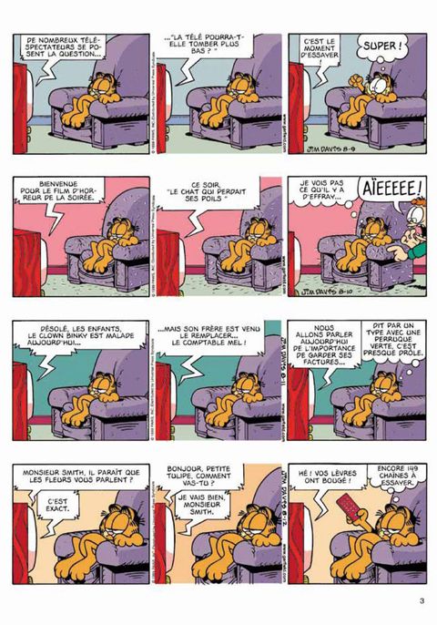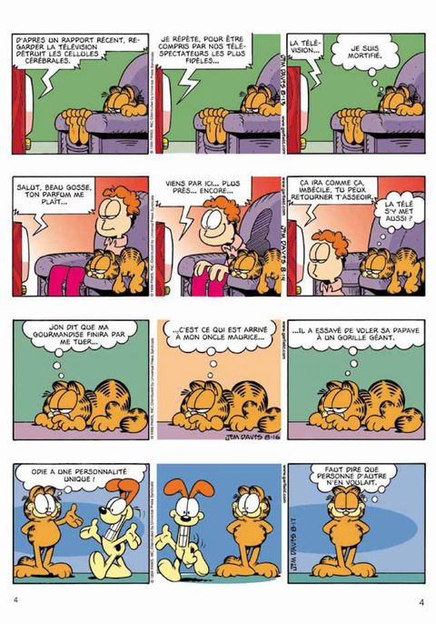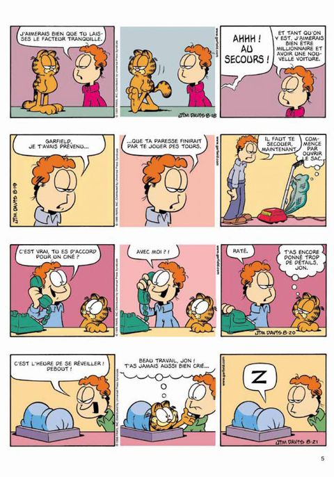 La sortie d'un nouvel album de Garfield est un événement éditorial qu'il convient de saluer avec faste : concours de zapping, lancer de chaton et de chien idiot, et, surtout, tournée générale de lasagnes !... C'est Jon qui régale, bien sûr.