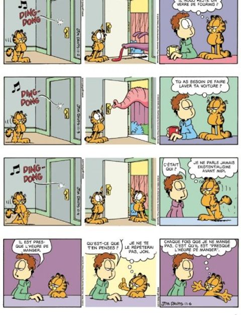 Garfield ne connaît qu'un chemin entre son lit et sa gamelle : tout schuss, à fond et tant pis pour les autres. Piétinant Odie et Jon, rien ne saurait l'arrêter dans sa course à la goinfrerie et aux calories. Gare aux imprudents ! ! !