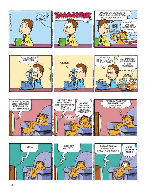 Le chat glouton se remet au travail pour son apparition printanière ! L’album met en scène les cruels dilemmes de notre chat préféré : doit-il se resservir à manger deux ou trois fois ? Est-il impératif d’interrompre sa sieste quand de la nourriture apparaît ? Faut-il se moquer de Jon, son maître, ou bien se moquer de lui ? Une bonne nuit de sommeil, est-ce douze ou vingt heures ? Allez Garfield, au travail !