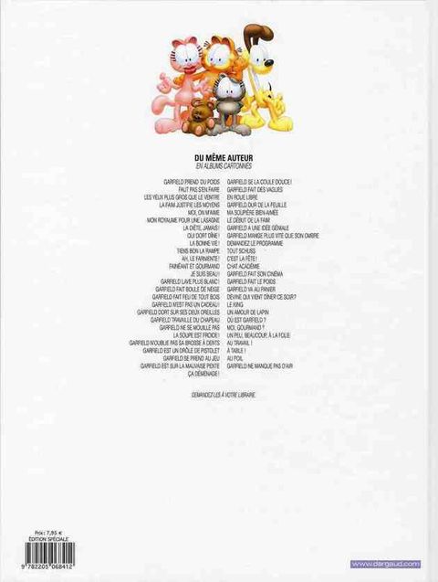Chaque repas est une fête pour Garfield ! Et un cauchemar pour Jon, son soi-disant « maître »... Garfield est aussi un danger pour tous les livreurs de pizzas de la terre, tous les réveils-matin du monde, toutes les araignées de la Création, et tous les chiens de garde du quartier ! Attention, rien n'arrête un chat glouton sur le chemin de sa gamelle...