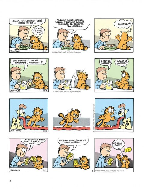 Le tome 8 de Garfield maintient le niveau avec des gags toujours aussi percutants. L'humour reste varié, touchant à différents aspects de la vie quotidienne de Garfield, Jon et Odie. Les dessins simples mais efficaces capturent parfaitement l'esprit de chaque situation comique.