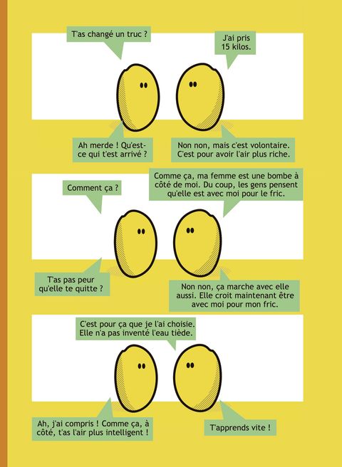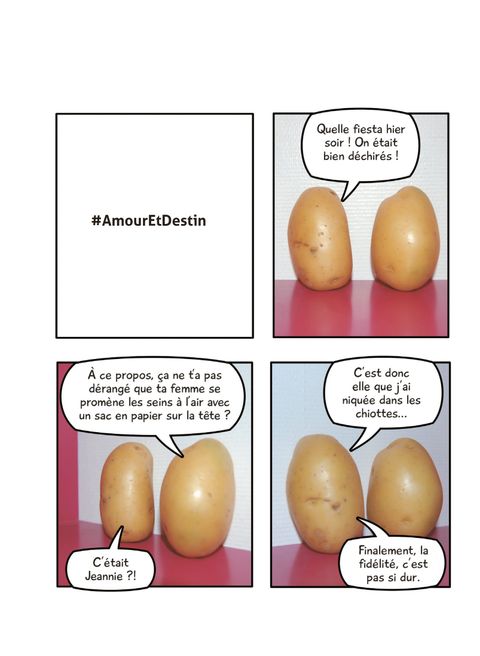 Spectaculaire ! En atteignant son 5e opus, la saga des Patates rejoint les plus grandes série de notre époque, comme Harry Potter, Resident Evil ou Fast et Furious. Fast 5, cest celui au Brésil avec le gros coffre quils trainent dans la ville et les favelas. Patates 5, cest pareil, un humour riche, un peu lourd parfois mais spectaculaire, qui fouille les bas-fonds de la psyché humaine. En revanche, Patates, cest beaucoup plus drôle que Fast et Furious ou Harry Potter. Ce nouvel Patates sort chez Gargouilles. C'est la toute nouvelle marque des éditions lapin, qui va explorer les frontières de l'humour noir et de l'humour trash.