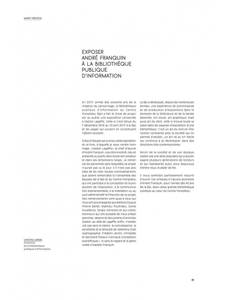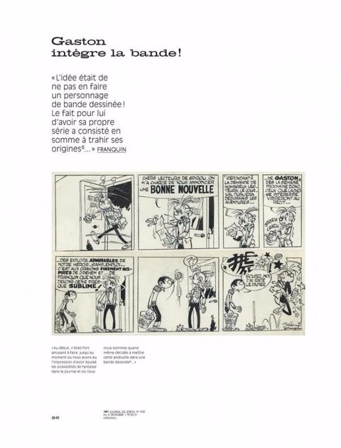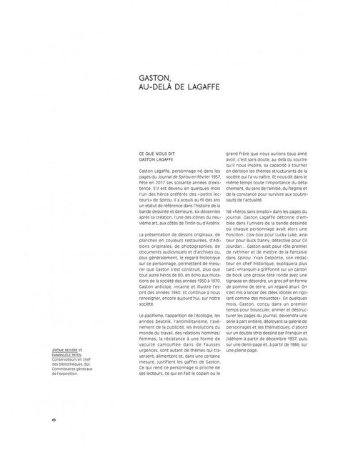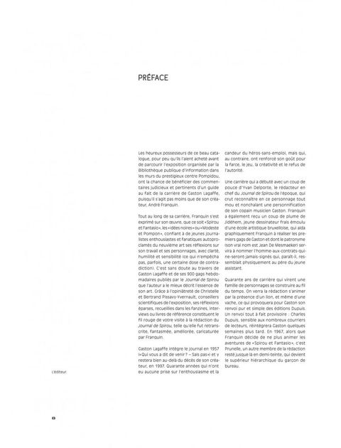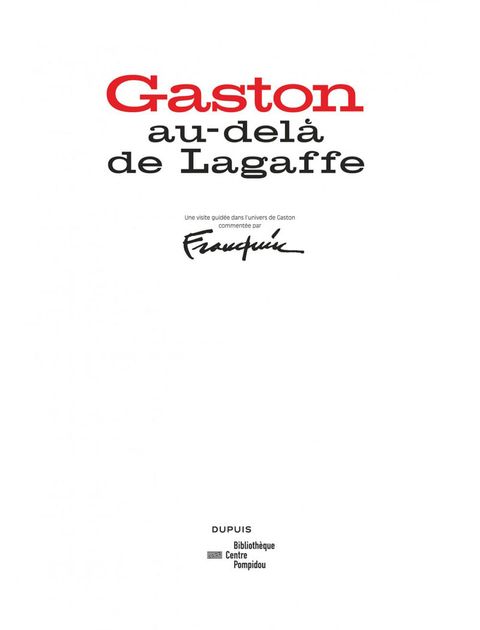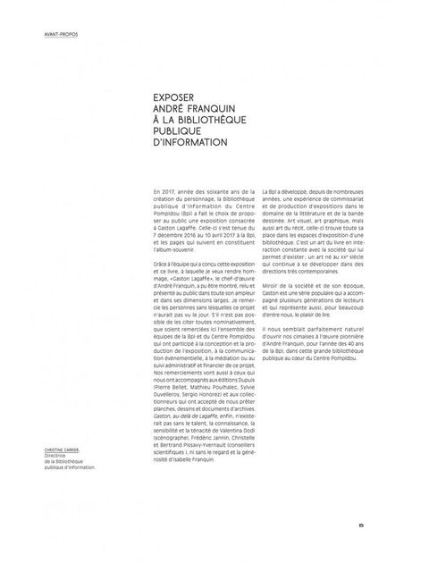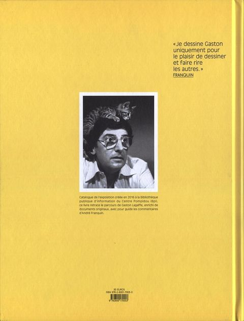 Catalogue de l expo Centre Pompidou du 7 décembre 2016 au 10 avril 2017 Alors que les Éditions Dupuis célèbreront en 2017, les 60 ans de Gaston Lagaffe, la Bpi du Centre Pompidou lui consacre une exposition qui se tiendra du 7 décembre 2016 au 10 avril 2017. Cet ouvrage nous révèle les coulisses du travail de Franquin, la pertinence de son regard sur une société en permanente évolution et son lien infini avec ce personnage. En 1957, personne n'avait perçu autant que lui combien la jeunesse aspirait à de nouvelles valeurs, dont les évènements de Mai 68 marquèrent l'avènement. Gaston, héros sans emploi, mais héros de son époque assurément. Ce catalogue d'exposition de plus de 200 pages est riche d'une iconographie de grande qualité, alternant les documents d'archives, les photographies ou les dessins originaux, chaque fois mis en lumière par de nombreux extraits d'entretiens et commentaires de Franquin lui-même. Nul doute que ce catalogue réjouira tous les amateurs de cette oeuvre hors norme et deviendra rapidement un livre de référence. - "On est conquis !" (DBD)