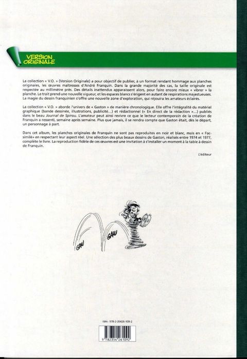 Lancée en 2005, la collection V.O. propose de (re)découvrir les gags de Gaston Lagaffe dans une édition noir et blanc, en fac-similé, qui donne toute sa dimension à l'extraordinaire talent de Franquin. On ne présente plus Gaston, gaffeur impénitent et inventeur farfelu, véritable ovni dans les bureaux de la rédaction du Journal de Spirou où il sème une joyeuse pagaille. Du brigadier Longtarin, à Bertrand Labévue, en passant par M. De Mesmaeker, M'oiselle Jeanne ou Prunelle, sans oublier le chat et la mouette rieuse, on retrouve là encore tout le petit monde de Gaston. L'intégralité des gaffes du garçon de bureau le plus célèbre de la bande dessinée publiées dans Le journal de Spirou entre 1974 et 1977 sont réunies dans ce très beau recueil.