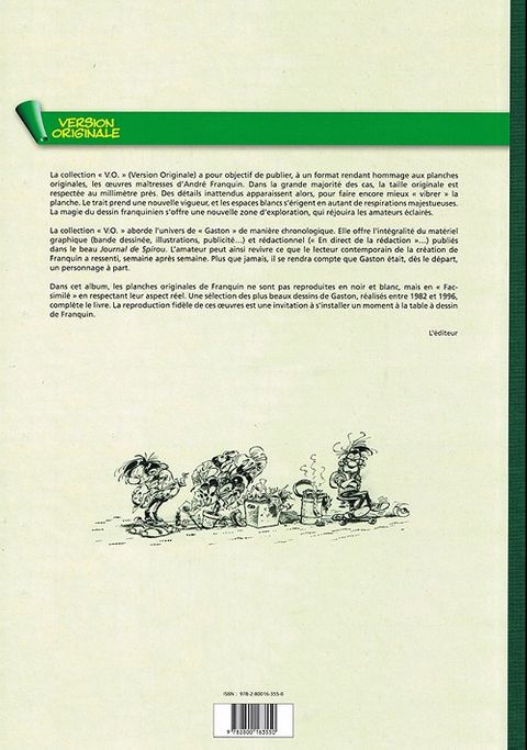 Lancée en 2005, la collection V.O. propose de (re)découvrir les gags de Gaston Lagaffe dans une édition noir et blanc, en fac-similé, qui donne toute la mesure du trait nerveux et virtuose d'André Franquin. Une période décousue, pendant laquelle Franquin, pris au milieu de ses projets de dessins animés du Marsupilami et des Tifous, continue à animer le personnage de Gaston Lagaffe, et ce jusqu'à sa disparition, survenue en janvier 1997. L'intégralité des gaffes du garçon de bureau le plus célèbre de la bande dessinée publiées dans Le journal de Spirou entre 1982 et 1996 sont réunies dans ce très beau recueil.
