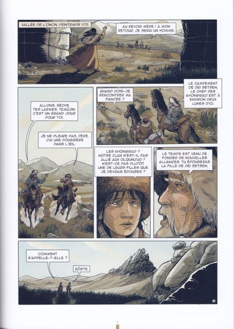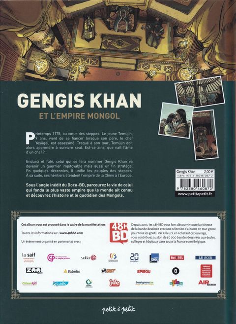 Le nom de Gengis Khan est resté célèbre dans l'histoire. Mais que sait-on vraiment de l'homme qui se cachait sous l'armure du guerrier ? À travers ce Docu-BD, découvrez comment la naissance d'un jeune garçon dans les steppes mongoles va bouleverser l'histoire. De l'intimité de son clan aux grandes conquêtes, en passant par les guerres de successions et l'incroyable héritage qu'il laissa, parcourez le destin extraordinaire de Gengis Khan et du plus grand empire de tous les temps. Agrémenté de pages documentaires riches en archives, cet album vous invite aussi à découvrir la vie nomade et les traditions des Mongols, leurs croyances, l'art des chamanes, l'architecture, la politique...