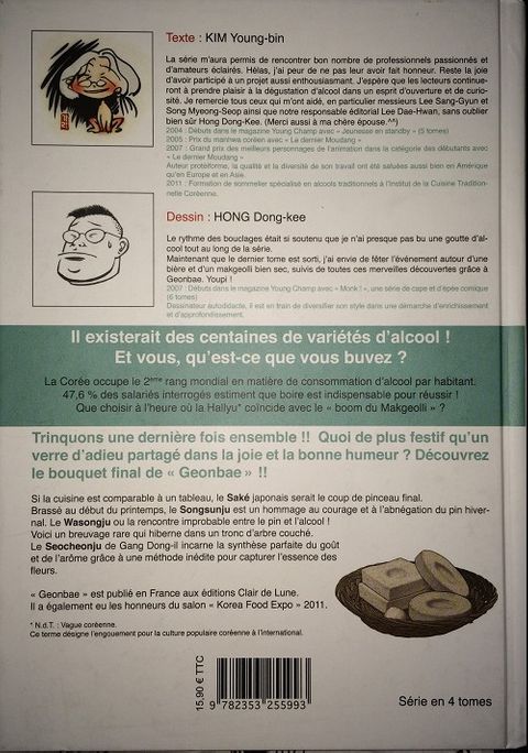Il existerait des centaines de variétés d'alcool ! Et vous, qu'est-ce que vous buvez ? La Corée occupe le 2ème rang mondial en matière de consommation d'alcool par habitant. 47,6 % des salariés interrogés estiment que boire est indispensable pour réussir ! Que choisir à l'heure où la Hallyu* coïncide avec le " boom du Makgeolli " ? Explorez la gastronomie et les boissons traditionnelles coréennes en compagnie de " Geonbae " dont la lecture s'avère aussi savoureuse qu'instructive !