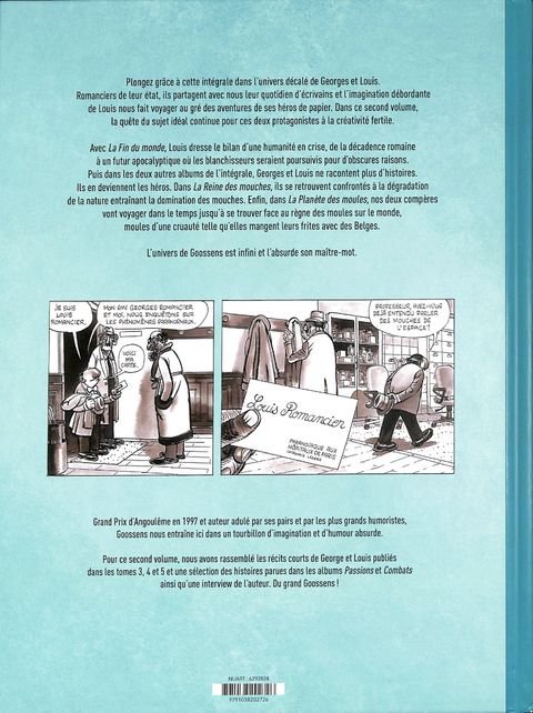 Grand Prix d'Angoulême en 1997 et auteur adulé par ses pairs et par les plus grands humoristes, Goossens nous entraîne ici dans un tourbillon d'imagination et d'humour absurde. Georges et Louis font leur apparition dans le magazine Fluide Glacial en 1990. Romanciers de leur état, ils partagent avec nous leur quotidien d'écrivains et l'imagination débordante de Louis nous fait voyager au gré des aventures de ses héros de papier. Dans ce second volume de leurs aventures, ils seront tour à tour confrontés à la dégradation de la nature qui amènera au règne des mouches, à la Fin du monde et voyageront sur la Planète des mouches