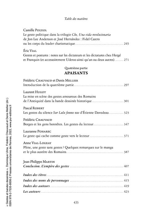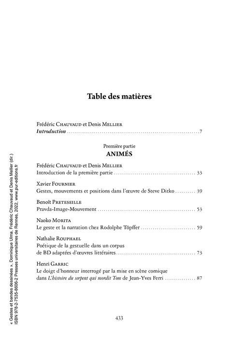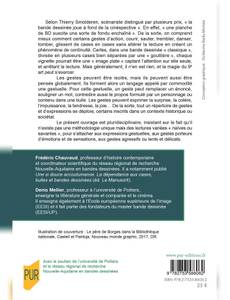 À Cerisy, en août 1987, Thierry Smolderen, scénariste distingué par plusieurs prix, avait proposé une réflexion sur le mouvement. Selon lui « la bande dessinée joue à fond de la cinéspective ». En effet, « une planche de BD suscite une sorte de fondu enchaîné ». De la sorte, on comprend mieux comment certains gestes d'action, courir, sauter, trembler, danser, tomber, glissent de cases en cases sans altérer la lecture en créant un phénomène de continuité. Certes, dans une bande dessinée « classique », divisée en plusieurs cases bien séparées par une « gouttière », chaque vignette pourrait être une « image plate » captant l'attention sur elle seule, et arrêtant la lecture, mais généralement, il n'en est rien et la magie du 9e art peut s'exercer. Les gestes peuvent être isolés, mais ils peuvent aussi être pensés globalement. Ils forment alors un langage appelé par commodité gestuelle. Un geste peut remplacer un énoncé, souligner un mot, contredire aussi le propos formulé par un personnage ou contenu dans une bulle. Les gestes peuvent exprimer la surprise, la colère, l'impuissance, la tendresse, la joie… de la sorte tout un répertoire de gestes et d'expression se déploie, certains inscrits dans un contexte historique ou sociétal. Le présent ouvrage est pluridisciplinaire insistant sur le fait qu'il n'existe pas une méthodologie unique mais des lectures variées « naïves ou savantes », pour s'attacher aux expressions gestuelles, aux gestes porteurs d'émotions et de sensations, aux gestes agressifs ou lents et délicats.