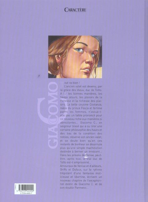 Parmeno, bravache, buveur, menteur et accessoirement valet de Giacomo C., vit les plus belles heures de sa vie. Finies les tâches subalternes, place aux fastes des fêtes galantes, au plaisir de parader vêtu de somptueux habits, à la joie de posséder argent, pouvoir, et de se voir nommer par tous Duc de Totto... Mais derrière ce qui ressemble à un conte de fées se trame, à mots feutrés, une insidieuse machination où le pauvre Parmeno risque à tout moment de perdre les plaisirs de la vie... Et la belle cousine Costanza, nièce du prince Fosca et femme parmi les femmes, n'avoue-t-elle pas un faible prononcé pour ce nouveau riche aux manières si déroutantes oe... Voici, avec ces volumes 4 et 5 , la suite des rééditions de la série culte « Giacomo C. » dans la collection Caractère. Des maquettes redesignées, de nouvelles couvertures et de nouvelles couleurs réalisées de main de maître par Griffo. Un événement de taille pour l'un des plus grands séducteurs de la bande dessinée !