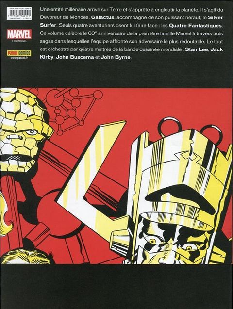 Galactus ! Son nom fait trembler les civilisations, car cet être cosmique sillonne l'espace à la recherche de mondes capables d'assouvir sa faim, qu'ils soient habités ou non ! Plusieurs fois, ses pas l'ont conduit jusqu'à notre planète, et il a fallu toute la ténacité des Quatre Fantastiques pour le repousser. Cet album en format géant recueille trois histoires des Quatre Fantastiques les opposant à l'un de leurs plus terrifiants adversaires, le géant Galactus. Les deux premières sagas sont signées Stan Lee, épaulé d'abord par Jack Kirby puis par John Buscema, tandis que la dernière est de John Byrne. Des épisodes qui ont fait l'histoire, parfaits pour célébrer le soixantième anniversaire de l'équipe !