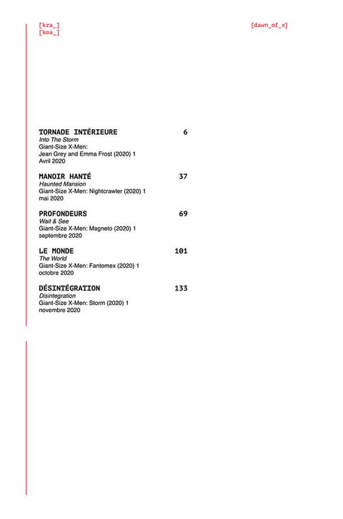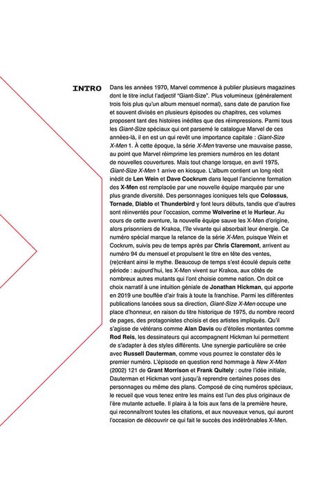 Cinq histoires complètes ! Une menace force Jean Grey et Emma Frost à travailler ensemble. Diablo s'aventure dans l'inconnu quand Krakoa perd le contact avec des mutants. Magnéto s'habitue à l'idée de devoir collaborer avec les humains. Fantomex retourne au Monde qui l'a vu naître. Enfin, Tornade doit contrecarrer un complot insidieux. En marge de la série X-Men et dans le cadre de son relaunch des séries mutantes, Jonathan Hickman a produit toute une série d'aventures en solo pour certains des membres les plus emblématiques de l'équipe, aux côtés des dessinateurs les plus prestigieux. Nous les recueillons ici dans ce qui est un addendum indispensable à l'album MARVEL DELUXE : X-MEN sorti fin 2022.
