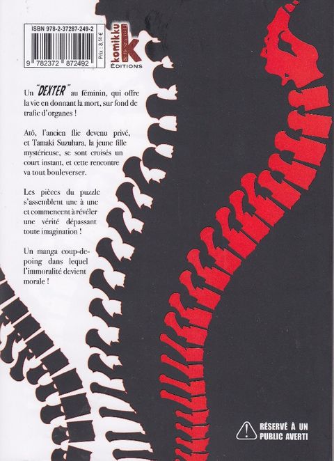 Un « DEXTER » au féminin, qui offre la vie en donnant la mort ! Tamaki Suzuhara est une mystérieuse jeune fille qui manie le scalpel comme personne. Avec son associé Takashi, elle s'est spécialisée dans la vente d'organes. Leurs proies sont les pires rebuts de la société, les criminels les plus infâmes qui ne méritent plus de vivre ! Un manga coup-de-poing dans lequel l'immoralité devient morale !