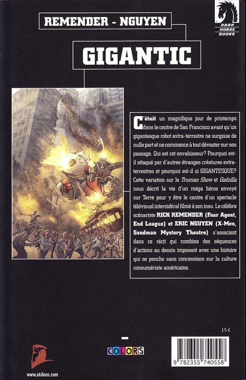 C'était un magnifique jour de printemps dans le centre de San Francisco avant qu'un gigantesque robot extra-terrestre ne surgisse de nulle part et ne commence à tout dévaster sur son passage. Oui est cet envahisseur ? Pourquoi est-il attaqué par d'autres étranges créatures extra-terrestres et pourquoi est-il si Gigantesque ? Cette variation sur le Truman Show et Godzilla nous décrit la vie d'un méga héros envoyé sur Terre pour y être le centre d'un spectacle télévisuel intersidéral filmé à son insu. Le célèbre scénariste Rick Remember (Fear Agent, End League) et Eric Nguyen (X-Men, Sandman Mystery Theatre) s'associent dans ce récit qui combine des séquences d'actions au dessin imposant avec une histoire qui se penche sans concessions sur la culture consumériste américaine.