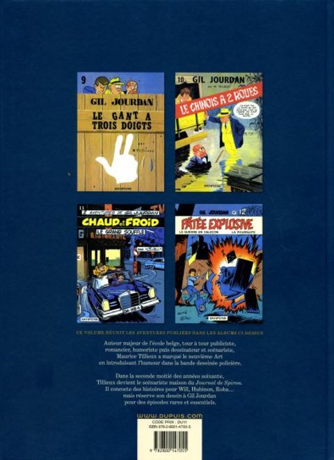 Gil Jourdan, licencié en droit et enquêteur de choc, met à nouveau le mystère K.O. À partir de 1964, Tillieux devient l'un des scénaristes vedettes des éditions Dupuis, qui lui ont confié plusieurs séries en parallèle - « César », « Tif et Tondu », « Jess Long ». Conséquence directe de l'accroissement de son activité : les histoires qu'il écrit pour « Gil Jourdan » sont plus courtes, et plus rares. Ce sont ces histoires courtes et les albums de la période 1964-1970 que réunit ce troisième volume de l'Intégrale. Action, mystère et humour caractérisent cette série emblématique de la BD franco-belge, lue par des générations de lecteurs de tous âges. Cette intégrale contient : - "Le Gant à trois doigts" - "Le Chinois à deux roues" - "Chaud et froid et Pâtée explosive" (Albums complets, histoires courtes, et inédits de la période 1964 -1970)