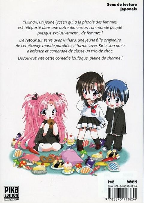 Yukinari, un jeune lycéen qui a la phobie des femmes, est téléporté dans une autre dimension : un monde peuplé presque exclusivement... De femmes ! de retour sur terre avec miharu, une jeune fille originaire de cet étrange monde parallèle, il forme avec kirie, son amie d'enfance et camarade de classe un trio de choc. découvrez vite cette comédie loufoque, pleine de charme !
