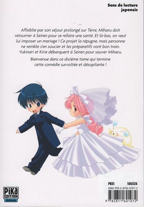 Affaiblie par son séjour prolongé sur terre, miharu doit retourner seiren pour se refaire une santé. et là-bas, on veut lui imposer un mariage ! ce projet la répugne, mais personne ne semble s'en soucier et les préparatifs vont bon train. yukinari et kirie débarquent à seiren pour sauver miharu. Bienvenue dans ce dixième tome qui termine cette comédie survoltée et désopilante !