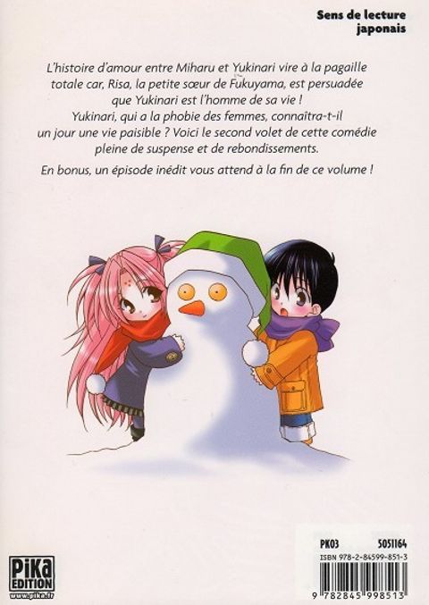 L'histoire d'amour entre Miharu et Yukinari vire à la pagaille totale car, Risa, la petite soeur de Fukuyama, est persuadée que Yukinari est l'homme de sa vie ! Yukinari, qui a la phobie des femmes, connaîtra-t-il un jour une vie paisible ? Voici le second volet de cette comédie pleine de suspense et de rebondissements. En bonus, un épisode inédit vous attend ô la fin de ce volume !\\0