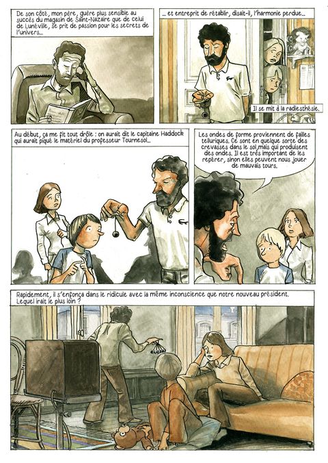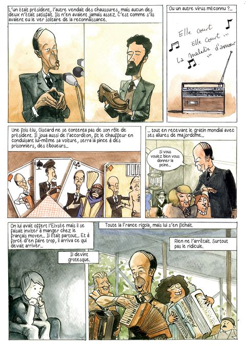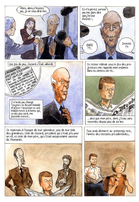 En 1974, François a 10 ans, lorsque Giscard remporte les élections. À la surprise générale, ce nouveau président élu par les voix de droite poursuit sa campagne, bien décidé à séduire désormais le peuple de gauche... Ce désir insatiable de reconnaissance et d'amour (qui conduira Giscard à sa perte), intrigue le jeune François. Il lui rappelle les errances de son père Serge. Éternel insatisfait, ce dernier entraîne sa famille d'est en ouest, au gré de ses frustrations professionnelles. Un manque de confiance chronique le rend perméable à l'influence du premier flatteur venu et à toutes sortes de lubies qui outillent sa quête d'idéal. Pendule, baguette de sourcier, puis communauté régie par un gourou sans scrupule apparaissent progressivement dans le quotidien de François. Tout comme Giscard, Serge ne recule devant aucune forme de ridicule. En 2009, François reçoit des nouvelles de son père, pour la seconde fois depuis 25 ans. De nouveau entre les mains d'un escroc, il s'apprête à tout perdre... Un témoignage poignant, et plein d'humour sur les frustrations affectives familiales.