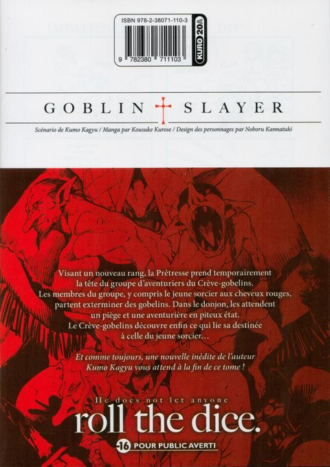 " Je ne sauve pas le monde. Je ne fais que tuer des gobelins. " La jeune Prêtresse fraîchement devenue aventurière découvre, dès sa première mission, à quel point des monstres aussi faibles que des gobelins peuvent représenter une menace effrayante. Heureusement, un homme en armure se décrivant comme le Goblin Slayer - un crève-gobelins - fait son apparition et abat un par un, sans aucune pitié, tous les gobelins qui lui font face pour la tirer de cette mauvaise posture.