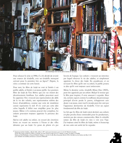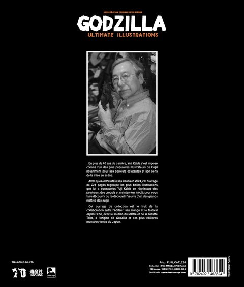 En plus de 40 ans de carrière, Yuji Kaida s'est imposé comme l'un des plus populaires illustrateurs de Kaïju notamment pour ses couleurs éclatantes et son sens de la mise en scène. Alors que Godzilla fête ses 70 ans en 2024, cet ouvrage de 224 pages regroupe les plus belles illustrations que lui a consacrées Yuji Kaida en réunissant des peintures, des croquis et un interview inédit, pour vous faire découvrir ou re-découvrir l'oeuvre d'un des grands maîtres des Kaïju. Cet ouvrage de collection est le fruit de la collaboration entre l'éditeur isan manga et le festival Japan Expo, avec le soutien du Maître et de la société Toho, à l'origine de Godzilla et des plus célèbres monstres venus du Japon.