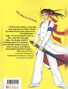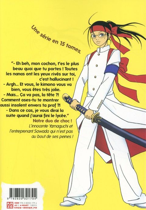 - Eh beh, mon cochon, t'es le plus beau quoi que tu portes ! Toutes les nanas ont les yeux rivés sur toi, c'est hallucinant ! - Argh... Et vous, le kimono vous va bien, vous êtes très jolie. - Mais... Ça va pas, la tête ?! Comment oses-tu te montrer aussi insolent envers ta prof ?! - Dans ce cas, je vous dirai la suite quand j'aurai fini le lycée."" Notre duo de choc ! L'innocente Yamaguchi et l'entreprenant Sawada qui n'est pas au bout de ses peines !
