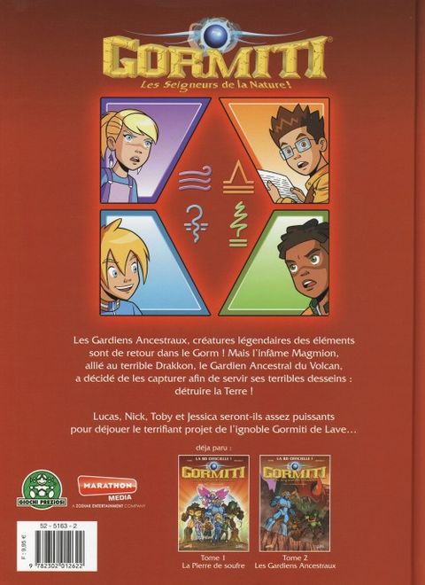 Les gardiens ancestraux, créatures légendaires des éléments sont de retour dans le Gorm ! Mais l'infâme Magmion, allié au terrible Drakkon, le gardien ancestral de feu, a décidé de les capturer afi n de servir ses terribles desseins : détruire la Terre ! Lucas, Nick, Toby et Jessica seront-ils assez puissants pour déjouer le terrifi ant projet de l'ignoble Gormiti de feu.
