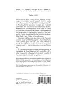 Génial scénariste d'une foule de personnages inoubliables parmi lesquels Astérix, «Lucky Luke», Rantanplan, Oumpah-Pah, Iznogoud et le Petit Nicolas, René Goscinny ne s'est pas contenté d'inventer des histoires et de remplir des bulles. Rédacteur en chef du journal Pilote et formidable découvreur de talents, il a marqué toute une génération en imposant ses auteurs : Bretécher, Gotlib, Mandryka, Druillet, Giraud/Moebius, Bilal, Tardi, Fred, F'Murr et bien d'autres. Goscinny se servait de l'humour comme on se sert de l'oxygène — machinalement, sans y penser, pour survivre. Et son aventure est aussi celle de la bande dessinée française au moment où, en grande partie grâce à lui, elle accède au statut de neuvième art.