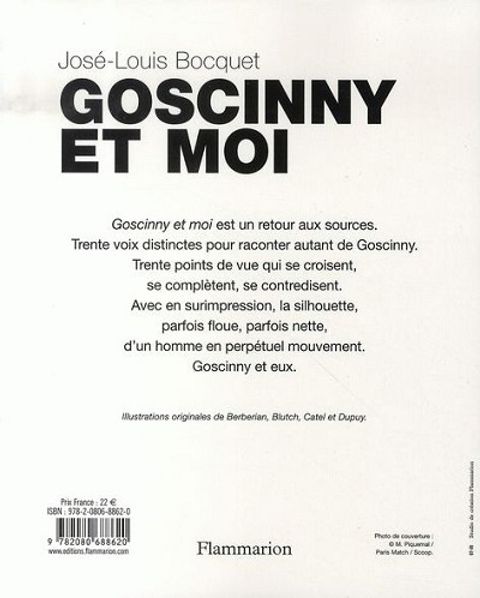 Goscinny et moi est un retour aux sources. Trente voix distinctes pour raconter autant de Goscinny. Trente points de vue qui se croisent, se complètent, se contredisent. Avec en surimpression, la silhouette, parfois floue, parfois nette, d'un homme en perpétuel mouvement. Goscinny et eux. Présentation Critique BD du "Figaro magazine", José-Louis Bocquet a recueilli les témoignages de celles et ceux qui ont connu René Goscinny, du berceau au tombeau : son frère Claude et sa fille Anne, et ses collaborateurs et complices du monde de la BD : Uderzo, Morris, Franquin, Greg, Bilal, Bretécher, Giraud, Vidal, Delporte, et du cinéma : Pierre Tchernia. Ces entretiens retracent le destin du créateur d’Astérix ainsi que toute l’histoire de la bande dessinée de 1945 à 2004. 30 témoignages de 1926 à 1977