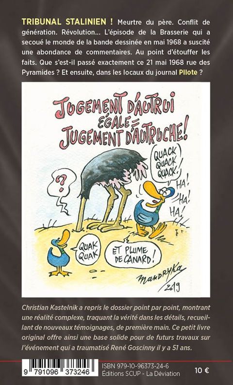 L'événement a traumatisé René Goscinny et secoué le monde de la bande dessinée en mai 68. Et tout particulièrement le journal Pilote. Tribunal stalinien ! Meurtre du père. Conflit de génération. Révolution⦠L'abondance de commentaires n'a-t-elle pas étouffé les faits ? Que s'est-il passé exactement ce 21 mai 1968 dans la Brasserie rue des Pyramides ? Et ensuite, dans les locaux du journal Pilote ? Christian Kastelnik a repris le dossier point par point, montrant une réalité complexe, traquant la vérité dans les détails, recueillant de nouveaux témoignages, de première main. Ce petit livre original offre ainsi une base solide pour de futurs travaux. Avec une préface et un dessin inédit de Mandryka.