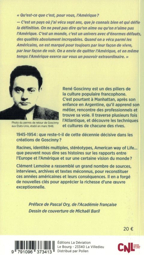 René Goscinny est un auteur majeur du XXe siècle. Peut être l’auteur français le plus lu, par le public le plus large, et depuis les années soixante. Pourtant, à la différence de Hergé par exemple, sa vie et son travail ont suscité relativement peu de travaux approfondis. Sa vie reste mal connue et sa période new-yorkaise est entourée de flou et d’imprécision. Clément Lemoine a senti l’importance de la décennie décisive passée par Goscinny entre New-York et l’Europe après son enfance en Argentine. Il est entré dans le détail comme personne avant lui, tout en dégageant les lignes de force de ces années d’apprentissage. Cela lui permet d’étudier les pratiques professionnelles importées par Goscinny mais aussi les nombreuses traces laissées par l’Amérique dans son Åuvre: héros américains, thème du voyage en Amérique, personnages d’Américains dans les différentes séries.
