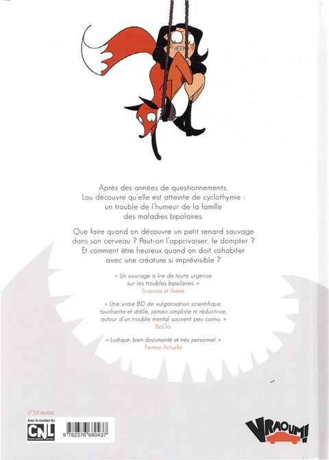 Lou est une jeune fille bien sous tout rapport. Jeune, jolie, elle conçoit des jeux vidéos, a un amoureux, des amis, une famille aimante… Bref, tout pour ne pas sombrer dans la déprime la plus noire. Sauf que voilà, de temps en temps, entre des périodes d’intense activité, sans raison, elle tombe dans le pot au noir, et un animal insatiable la dévore… un petit renard ! Soit son tempérament cyclothymique, sous la forme d’un petit renard capricieux. Car Lou est cyclothymique et, avec elle, le lecteur va découvrir le monde haut en contraste des maladies bipolaires. Hyper documenté, cartoonesque et ludique, ce roman graphique enmènera le lecteur découvrir ce qui se passe quan on a la tête envahie par ce petit renard hyperactif et boulimique, sur les traces autobiographiques de la jeune illustratrice.
