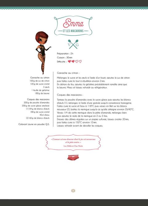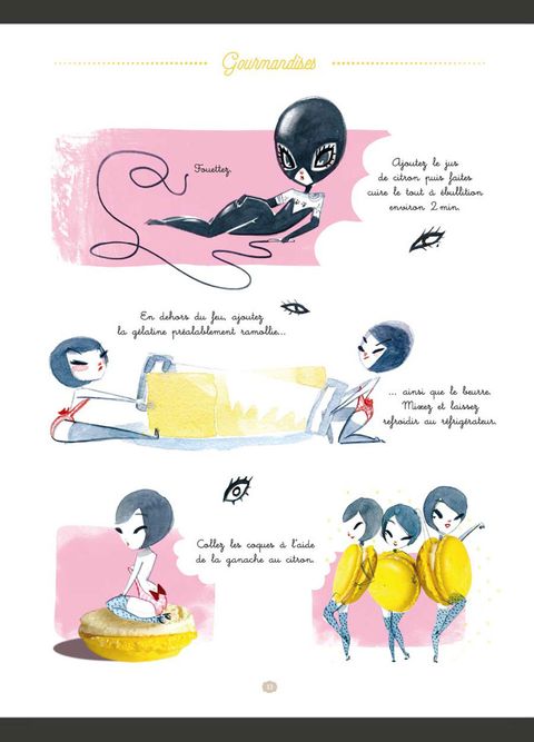 Un livre de 20 recettes sexy concocté par Adolie Day et Vincent Guerlais, un pâtissier-chocolatier français, qui stimule pupilles et papilles gustatives ! Après avoir oeuvré en tant que designer textile pour Catimini et Kenzo, puis dessiné des poupées pour Mattel ainsi que des bijoux pour La Marelle, Adolie a travaillé dans la publicité et illustré des livres pour la jeunesse, parmi lesquels Lilichou, une série de 12 titres. Elle expose aujourd'hui régulièrement en France, en Italie et aux États-Unis. Pour ce projet, elle s'est associée à Vincent Guerlais, maître pâtissier-chocolatier, membre de la prestigieuse association « Relais Desserts International » qui regroupe plus de 80 pâtissiers dans le monde. Il est aussi l'un des 10 lauréats nationaux de l'Award du Meilleur Chocolatier de France, décerné par l'Association des Croqueurs de Chocolat. Une distinction qu'il a obtenu 5 années de suite - entre 2008 et 2012. Porté par des personnages féminins rétro et glamour, sous la forme d'un mix narratif entre textes illustrés et bande dessinée, cet ouvrage présente 20 recettes gourmandes et sucrées réparties en 4 catégories : - Petites douceurs (madeleine, macaron, meringue, éclair.). - Tendres gâteaux (crumble, charlotte aux fraises, fondant au chocolat.). - Crèmes fondantes (riz au lait, crème brûlée, mousse au chocolat.). - Tartes pulpeuses (tarte tatin, tartelette aux framboises, tarte citron meringuée.). Cerise sur le gâteau, Chantal Thomass - auteur de la préface - est également l'héroïne de l'une de ces gourmandises sexy.