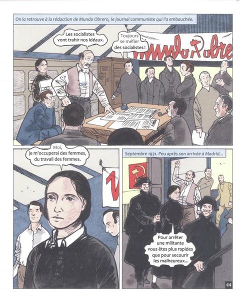 Une nouvelle femme fait son entrée dans la collection de bandes dessinées « Grands Destins de Femmes » : La Pasionaria ! Les deux auteurs, Michèle Gazier et Bernard Ciccolini, retracent la vie de Dolorès Ibárruri, mieux connue sous le nom de La Pasionaria, figure légendaire de la Guerre d'Espagne. Personnage complexe et obstiné, La Pasionaria, dont le surnom est une référence à la Passion du Christ, a mis son existence au service de ses idées et en a toujours payé le prix. Éclairant des pans parfois méconnus de son histoire, notamment les années qui précèdent et qui suivent la guerre elle-même, ce récit dessiné entend représenter la vie héroïque d'une femme que rien, a priori, ne destinait à devenir un tel mythe. De sa naissance en 1895, dans un milieu très modeste de Biscaye, province du Pays Basque espagnol, à sa mort à Madrid en 1989, en passant par un exil forcé de plus de trente ans en URSS suite à la victoire des forces franquistes, c'est un siècle de l'histoire espagnole, européenne et mondiale qui est donné à voir.