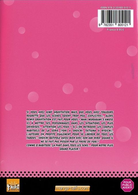 Voici les dojinshis tant attendus réalisés par Maki Murakami pour le Comiket de 1998 ! Vous croyez tout savoir et avoir tout vu sur nos protagonistes ? Laissez-vous porter par le rythme endiablé de ce livre ! Un des mangas les plus attendus en France ! Un retour aux sources pour les fans de Gravitation avec ces dojinshis ré-édités deux fois au Japon ; un manga toujours aussi rock et impétueux !