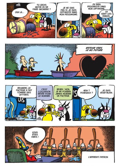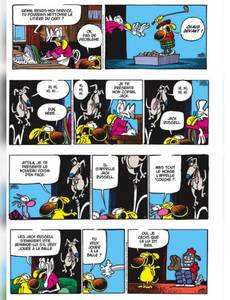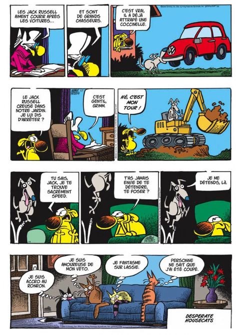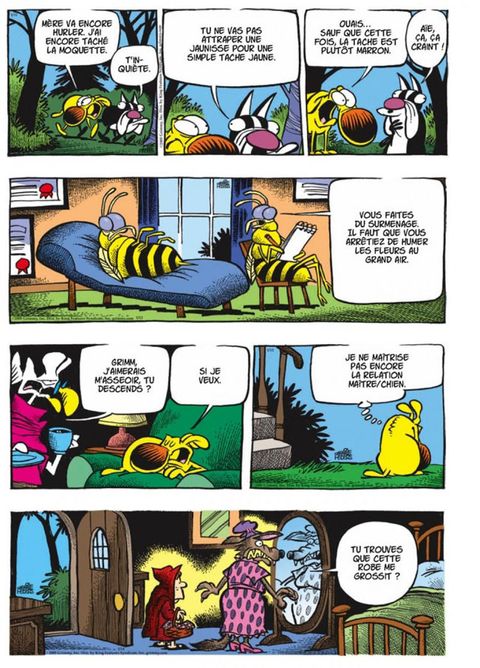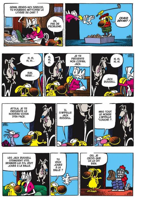 Mike Peters prend un soin tout particulier à nous faire hurler de rire avec son chien méchant. Grimmy est le pendant canin d'un Garfield : irrésistible ! Grimmy est placé par sa maîtresse dans une école de dressage : évidemment, celui qui en sortira dressé n'est pas notre allumé de chien favori ! Attila le chat a du mérite à être toujours en vie après les traitements infligés par Grimmy, qui, lui, se vautre dans des dizaines de poubelles différentes, se fait un nouveau copain d'un chien encore plus débile que lui, bref, la vie continue...