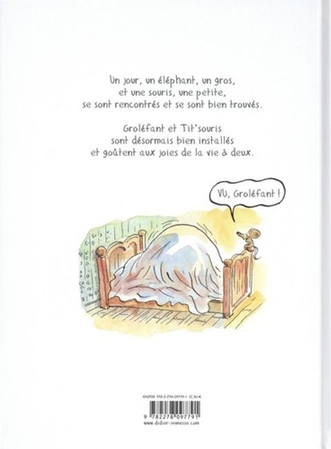 Un jour, un éléphant, un gros, et une souris, une petite, se sont rencontrés et se sont bien trouvés. Groléfant et Tirsouris sont- désormais bien installés et goûtent aux joies de la vie à deux.