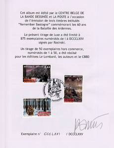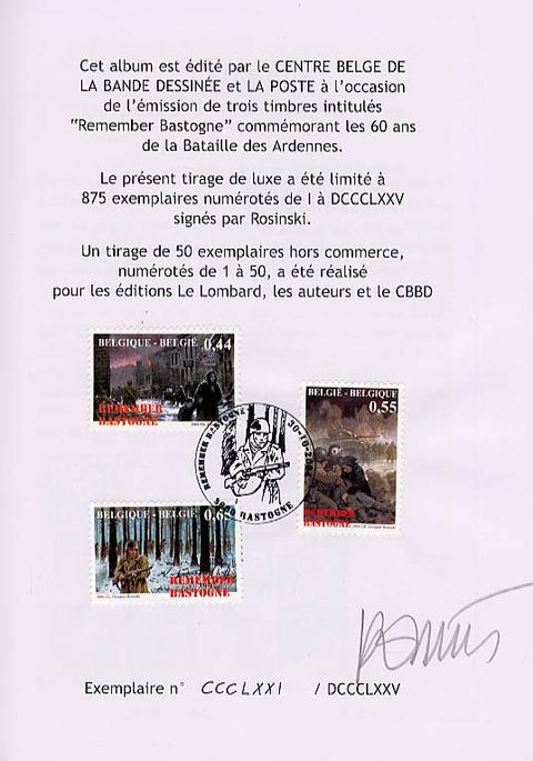Depuis sa découverte de la Bande Dessinée à l'age de 10 ans, Rosinski a toujours su que son destin serait de partager avec le public sa passion pour les images, quand elles racontent des histoires. De Thorgal au Comte de Skarbek, du Grand Pouvoir du Chninkel à Hans ou à la Complainte des Landes Perdues, il n'a cessé d'y parvenir en grand artiste.Cet album est édité par le Centre Belge de la Bande Dessinée et la Poste à l'occasion de l'émission de trois timbres intitulés "Remember Bastogne" commémorant les 60 ans de la Bataille des Ardennes. Le présent tirage de luxe (dos toilé) a été limité à 875 exemplaires numérotés de I à DCCCLXXC signés par Rosinski.